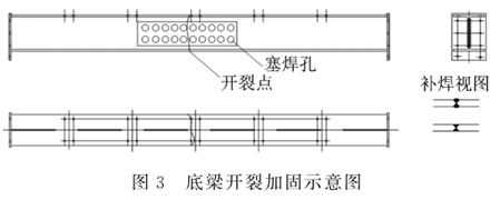 底梁主要在中间部位容易开裂,采用打坡口、焊接平,再加副板的方法解决,通过塞焊和断续焊接把副板和底梁固定在一起,能达到预期目的,延长使用寿命。