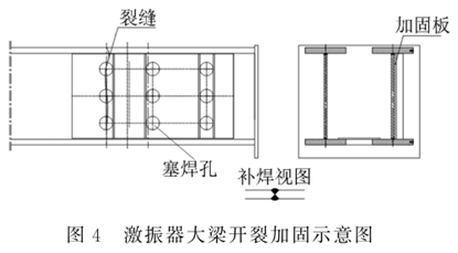 激振器大梁是设备强度最高的部位,发生开裂的情况甚少,但现场条件各有不同,若有开裂,其加固方案和底梁类似,但其坡口深度与钢板厚度一致,焊接质量要求高,副板以16mm~20mm钢板为主,必要时副板上增加强筋。