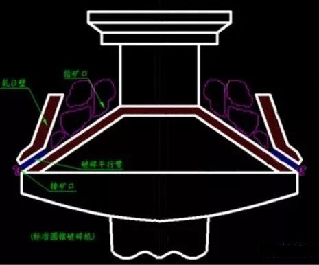 圆锥破的腔型分标准型、中型、短头型三种,鄂破,三者的区别在于破碎平行带,短头型平行带较长,中型次之,标准型最短,那何为破碎平行带呢?看下图: